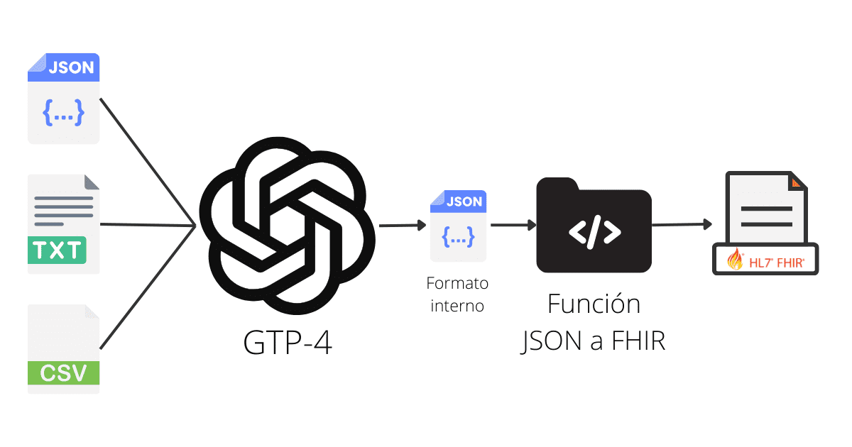Input de usuario (csv, txt, json) → LLM → JSON (formato propio) → Código de la aplicación → FHIRSi bien generar este JSON requiere más tokens que generar un CSV, es decir, es más costoso, ahora nos aseguramos de que tenga la estructura correcta, lo cual es mucho más fácil de lograr que al pedir un CSV.